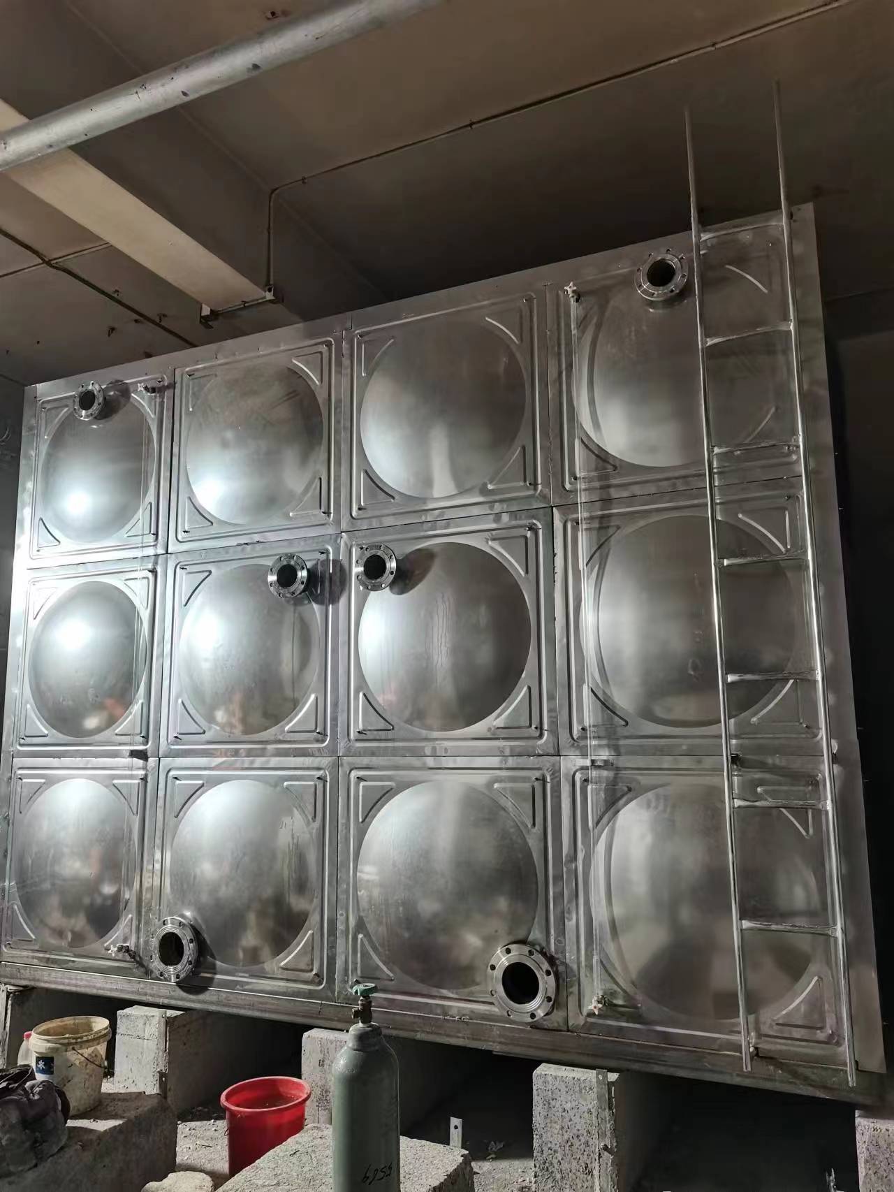 專業焊工現場氬弧焊接。施工現場有標準電源。水箱四周有≥500mm的檢修空間。外觀檢驗無銹蝕,無污染:注滿水2-3h,箱體無明顯變形,焊縫無滲漏為合格。