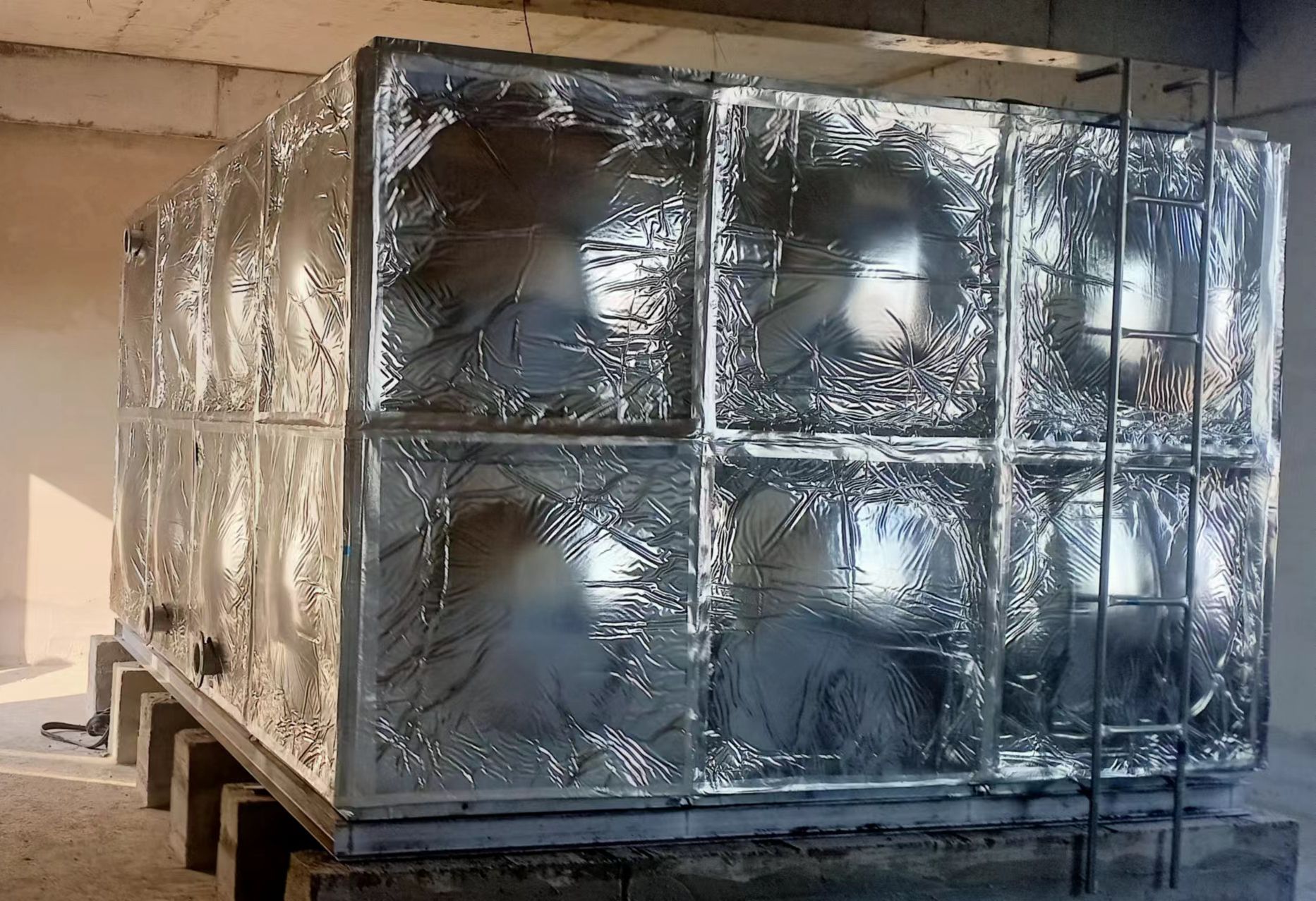 此水箱外表做了橡塑鋁箔布保溫層,山東騰翔水箱的橡塑鋁箔布保溫材料,使用溫度為-40℃至105℃,不易老化,經久耐用,防火等級達到B1級標準,具有較低導熱系數,平均溫度為0℃時為0.034w/mk,表面放熱系數高,達到9.5w/mk,并且鋁箔具有很好的阻燃性能,鋁箔橡塑保溫材料為閉泡式結構,且表面平整光滑,所以外界空氣中的水汽很難滲透到材料之中,保冷保溫不必再添加隔汽層,從而獲得較佳的導熱系數,它的陰濕因子大于4.5×103,使它的整體既是保溫層又是防潮層。因此適用于多種防火要求較高的場所使用。