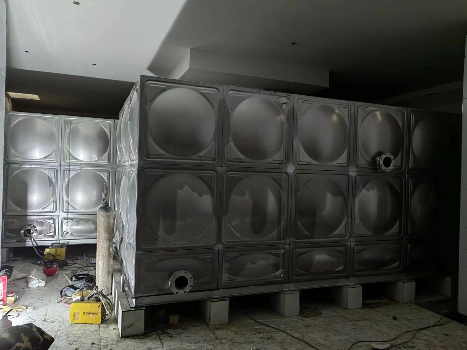 我司承接的河北省河北省廊坊市遠(yuǎn)洋琨庭給水項(xiàng)目已安裝試水完畢,此水箱用作給水泵房水箱使用。不銹鋼水箱內(nèi)部結(jié)構(gòu)包括:水箱框架、焊接管、水管、閥門、填料、蓋板、隔板、排水孔(上中下)和其它附件。不銹鋼水箱一般由框架結(jié)構(gòu)和焊接管兩部分組成,其中框架結(jié)構(gòu)包括:箱體及周圍的密封墊,箱體內(nèi)部的隔板及隔板固定螺絲,支架及支架固定螺絲,進(jìn)出水管,出水閥門等。