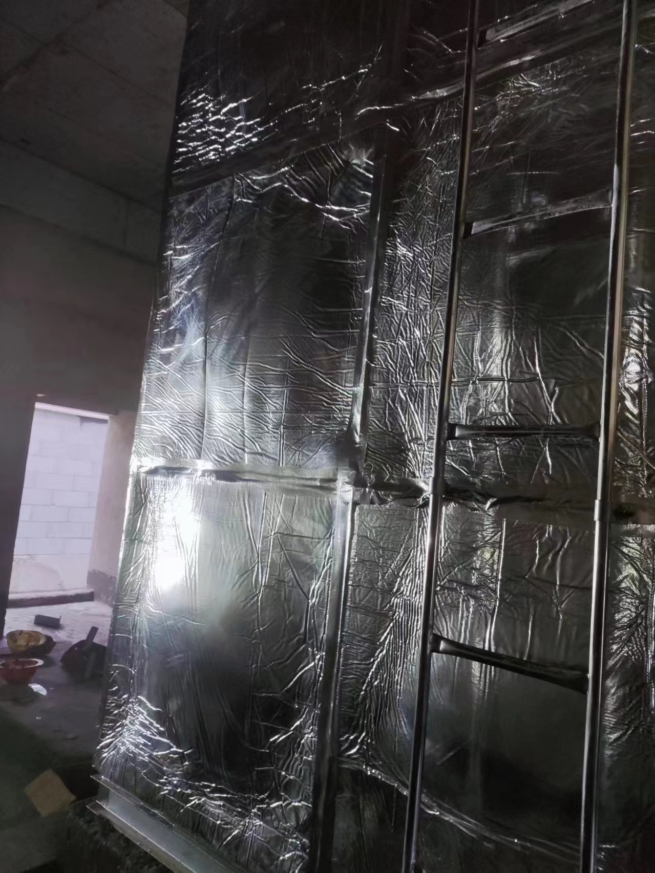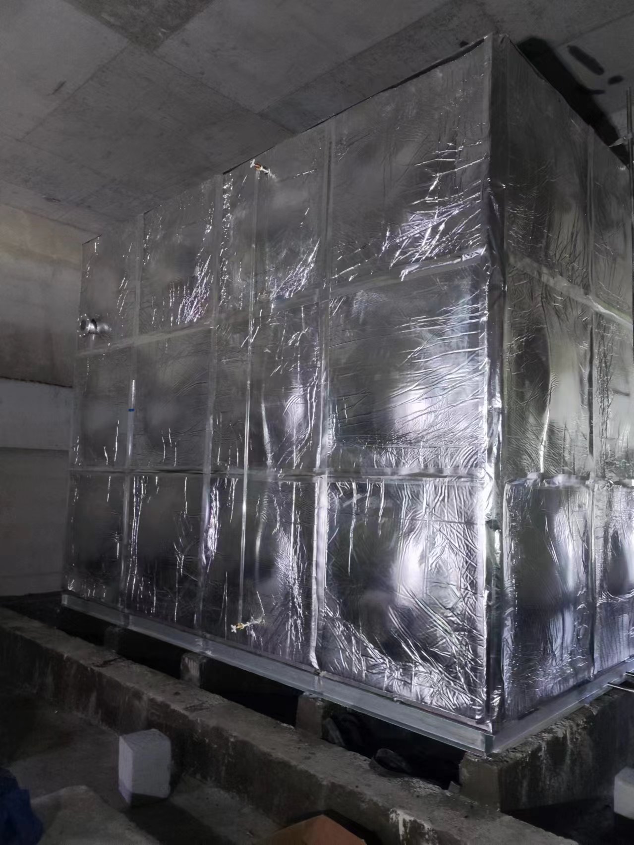 我司承接的山西省大同市中建三局職業技術學院辦公樓屋頂高位消防水箱項目,已經安裝試水完成。此水箱為高位鍍鋅鋼板消防水箱,外表做了橡塑鋁箔布保溫層,鋁箔橡塑保溫材料為閉泡式結構,且表面平整光滑,所以外界空氣中的水汽很難滲透到材料之中,保冷保溫不必再添加隔汽層,從而獲得較佳的導熱系數,它的陰濕因子大于4.5×103,使它的整體既是保溫層又是防潮層。因此適用于多種防火要求較高的場所使用。