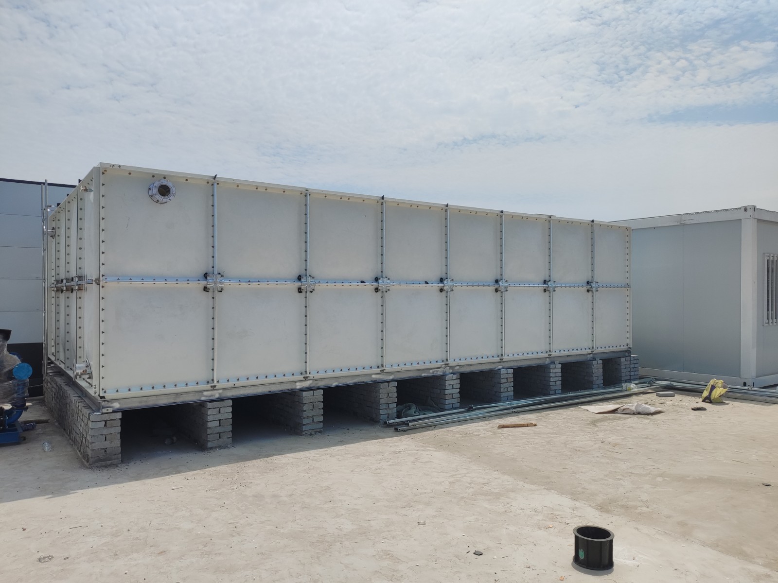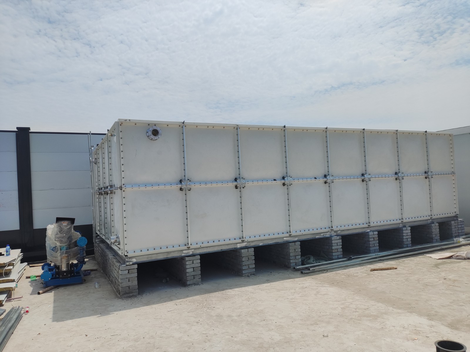 我司承接的山東省濟寧市濟南城建項目,玻璃鋼消防水箱已經安裝完成。玻璃鋼保溫水箱是由SMC模壓板塊、密封材料、金屬結構件及配管系統現場組裝而成。可根據用戶需要靈活組裝,若原有水箱需要更換,不需要改造房屋,適應性很強。水箱整體強度高,無滲漏,無變行,保養,檢修方便。