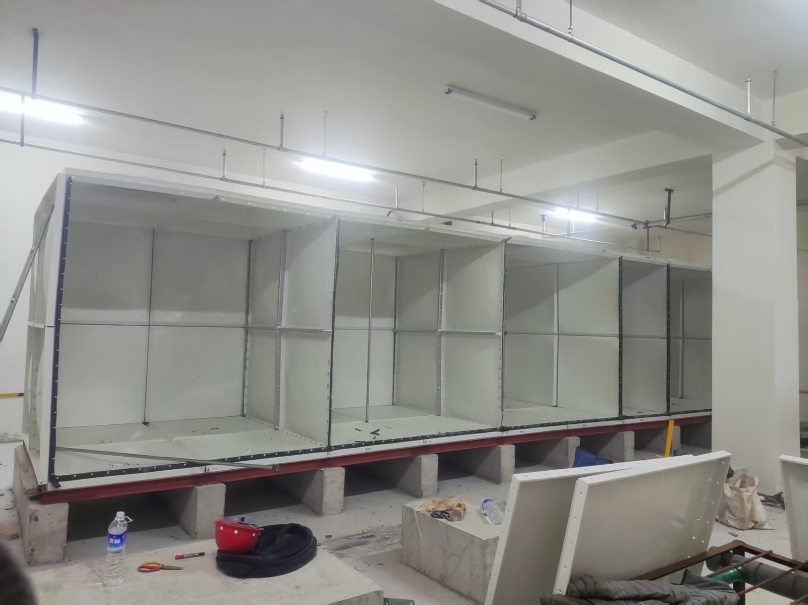 SMC組合式玻璃鋼水箱是一種普遍采用的儲水方式。是由SMC單元板現場組裝而成的一種水箱。單元板用SMC(sheet moulding compound)片材在高溫高壓下模壓成型,水箱內采用加強式支撐,其鋼配件選用熱鍍鋅件和不銹鋼件均可。板塊厚度的選取依據板塊所受的壓力和所處的位置。有5mm、8mm、10mm、12mm、14mm、16mm等。