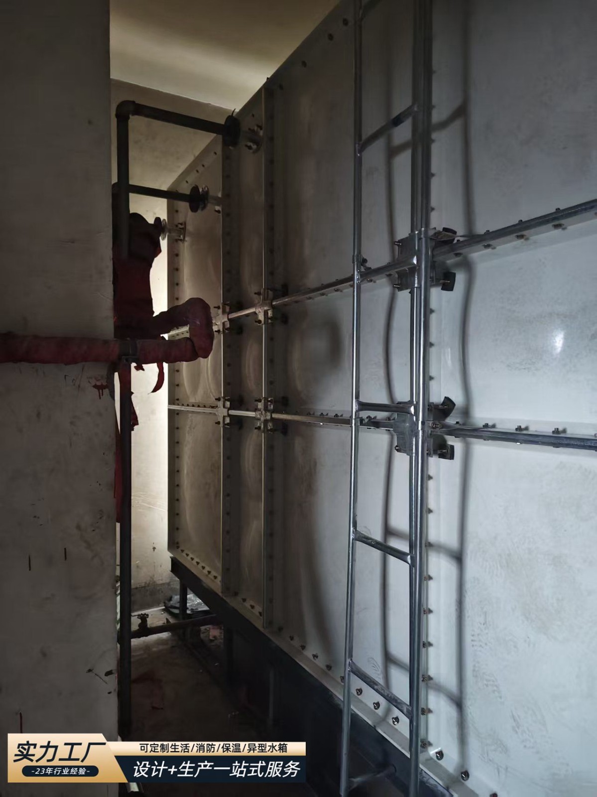 我司承接的天津河西新城大廈高位消防水箱項(xiàng)目,已安裝完畢。水箱安裝前是需要提前做基礎(chǔ)的,每個(gè)不同規(guī)格的玻璃鋼水箱都有不同的基礎(chǔ)要求的。玻璃鋼水箱底部應(yīng)設(shè)置高為50cm混凝土或者磚砌的基礎(chǔ),玻璃鋼水箱周圍和頂部應(yīng)該留有≥50cm的安裝與檢修空間,方便安裝人員檢修以及后期玻璃鋼水箱清洗與維護(hù)等。