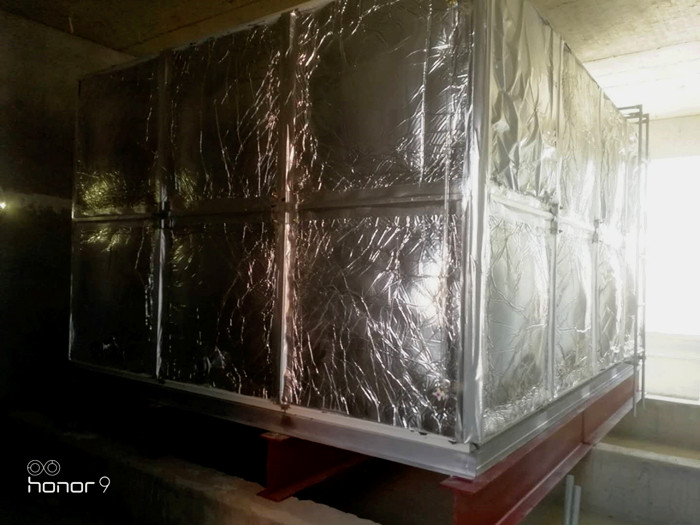 玻璃鋼橡塑保溫水箱安裝完成,水箱外部全部包裹橡塑保溫,使水箱內部水更保溫。